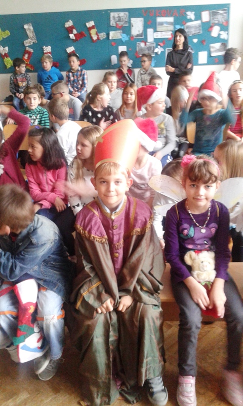 Za našu zajedničku razrednu priredbu pripremili smo pjesmu iz Početnice i pjesmicu iz Glazbene kulture. Naš Nikola se obukao u Sv. Nikolu i pomogao podijeliti poklone.