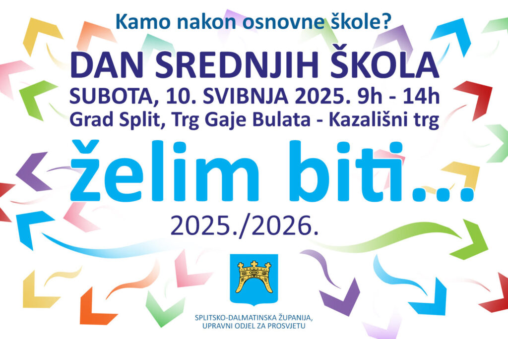 Manifestacija “Dan srednjih škola Splitsko dalmatinske županije” će se održati u subotu, 10. svibnja 2025. od 9:00 do 14:00 sati na prostoru Kazališnog trga – Trga Gaje Bulata, na platou ispred zgrade Hrvatskog narodnog kazališta u Splitu.