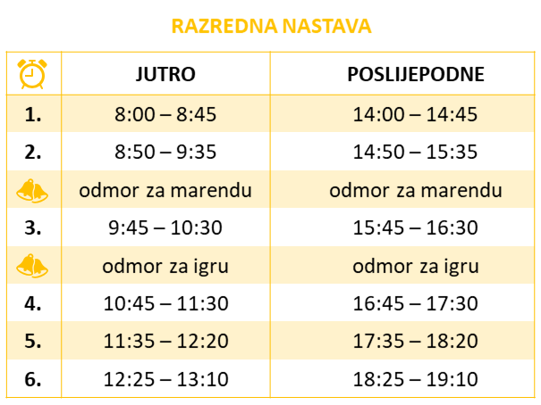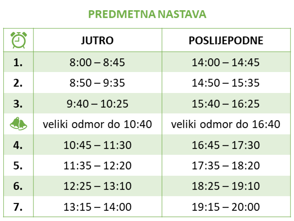 - Učenici predmetne nastave imaju samo jedan veliki odmor nakon 3. nastavnog sata za marendu i odmor.