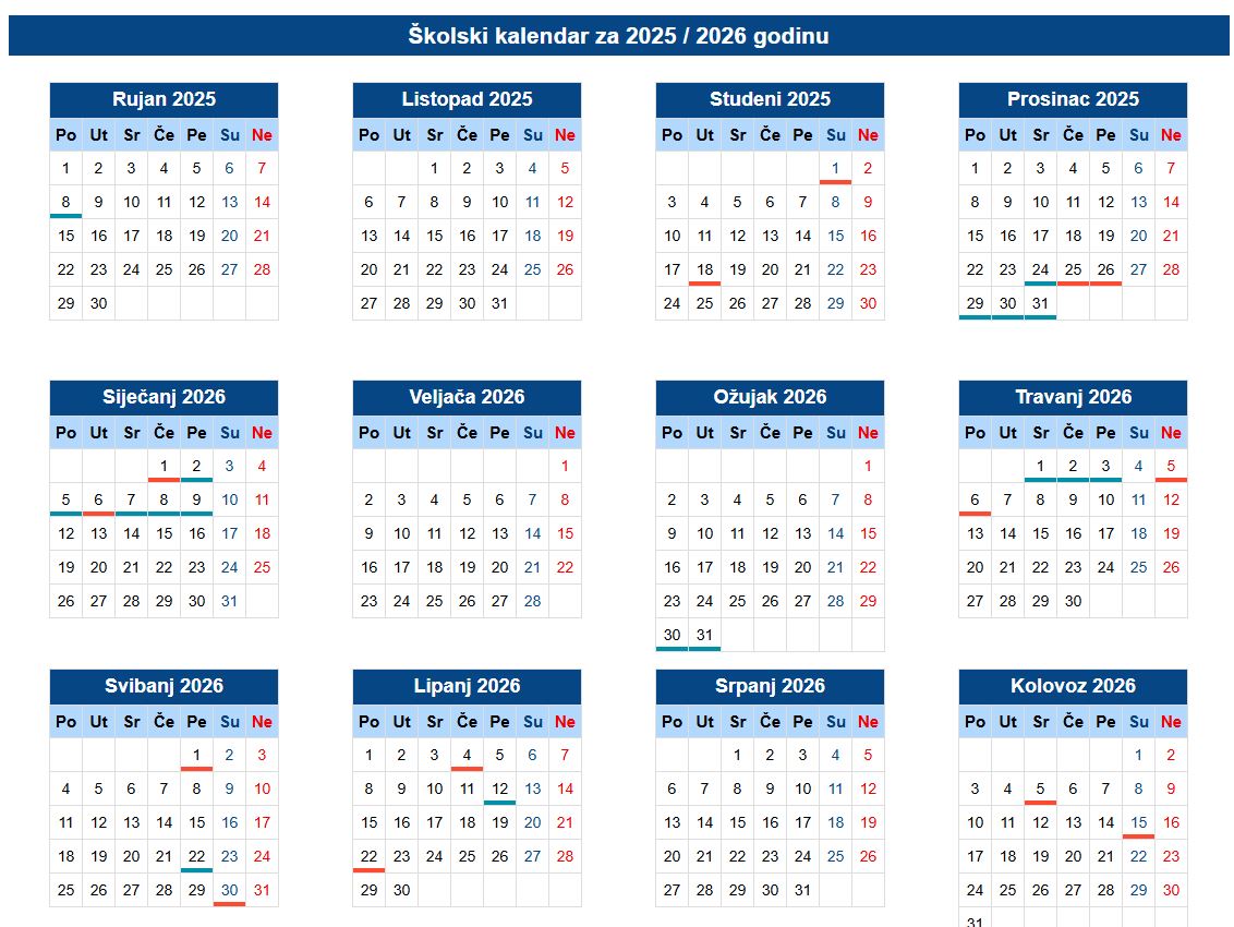 Nastavna godina počinje 8. rujna 2025. godine, a završava 12. lipnja 2026. godine.